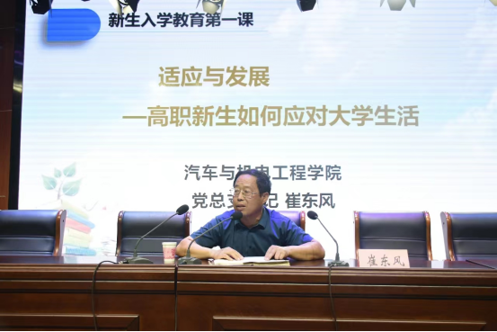 最后,崔东风书记为2023级新生上了入学教育第一课——《适应与发展-高职新生如何应对老员工活》。崔书记就员工如何应对老员工、度过大学时光;如何做职业规划和确定职业方向及能力;如何系统的学习专业知识;遇到困难如何克服和解决;如何专升本等几个方面进行讲解。同时围绕理想信念、团结互助和诚实守信等方面对同学们进行思想教育;要求同学们行胜于言,培养求真务实,脚踏实地的作风,增强责任意识。