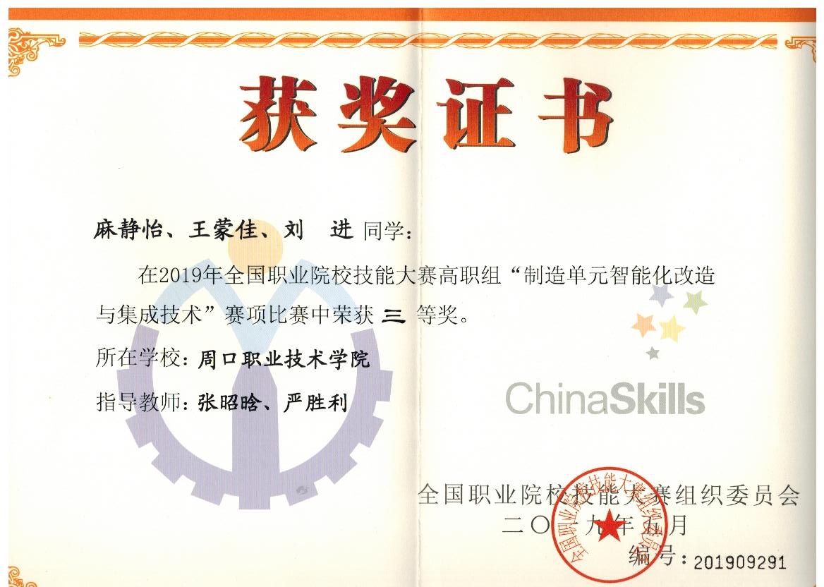 2019年全国职业技能大赛“制造单元智能化改造与集成技术”三等奖
