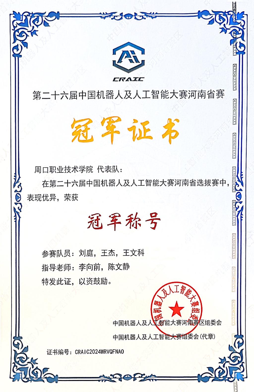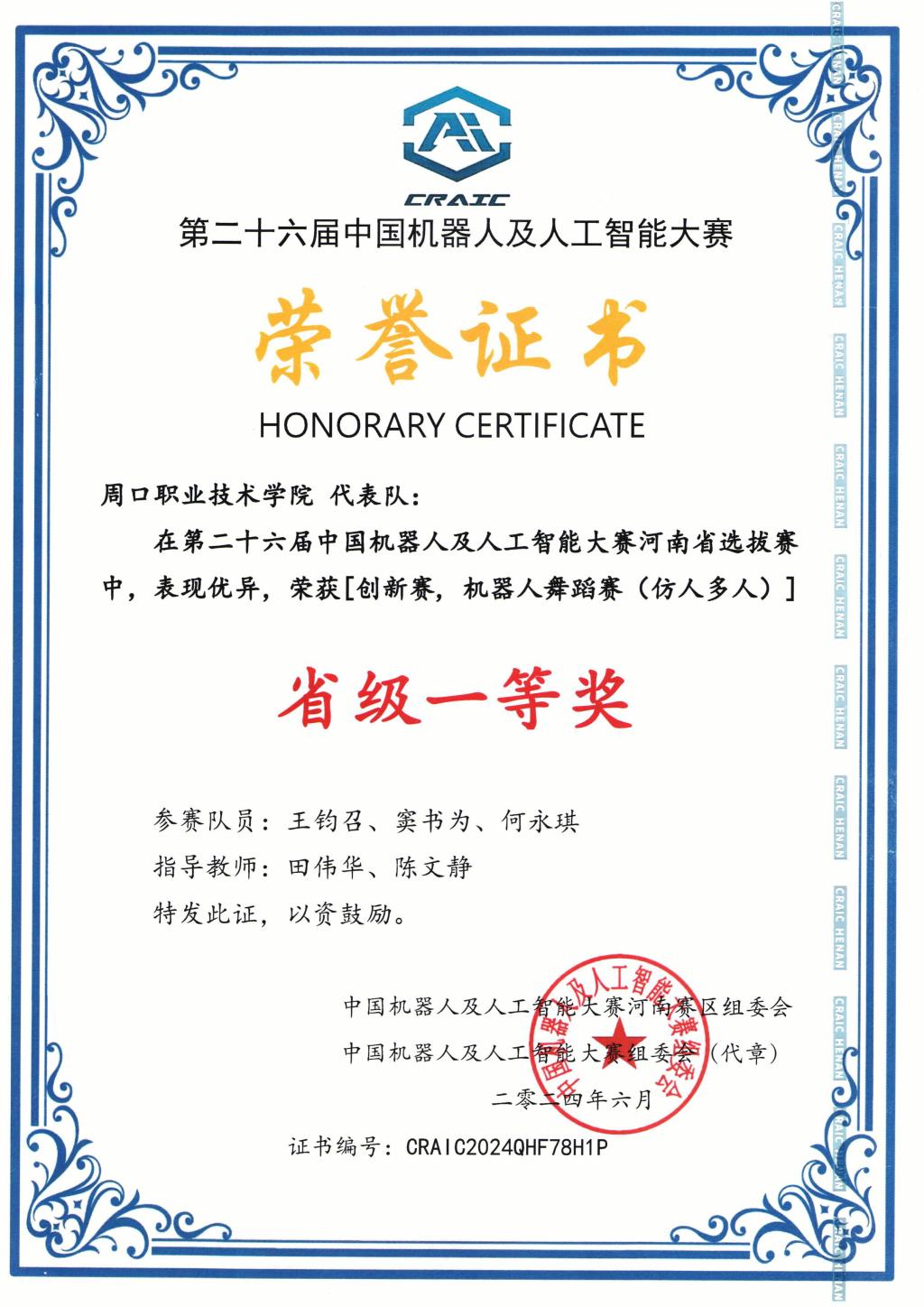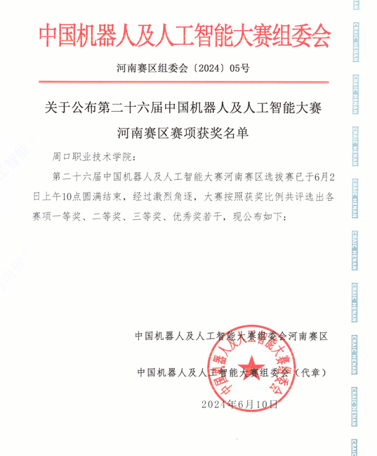 近日,第二十六届中国机器人及人工智能大赛河南赛区组委会发布了《关于公布第二十六届中国机器人及人工智能大赛河南省赛区赛项获奖名单》。公司在机器人多人舞赛项中荣获一等奖2项,其中李向前、陈文静指导的刘庭、王杰、王文科战队获得冠军。