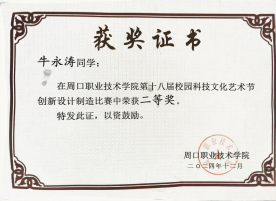 在追求学术卓越的同时,牛永涛同学也注重个人品德修养的提升。他担任班级团支书,尊敬师长,团结同学,耐心帮助同学们解决各种困难;同时担任院级员工会干部,认真配合老师工作,积极参与公司组织的各项活动,努力践行社会主义核心价值观。此外,牛永涛在课余时间积极参加公司组织的科技文化节活动,在365英国上市公司第十八届科技文化节创新设计制造比赛中表现优异,荣获二等奖。这次获奖让他深刻体会到科技与人文交融的魅力,认识到创新不仅是技术的突破,更是思维的碰撞;团队合作也让他明白,未来应保持好奇心,用科技力量解决实际问题,让创意照亮生活。
