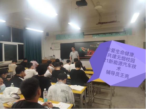 班会期间各班辅导员要求从我做起,营造无烟校园环境。自觉远离烟草,倡导文明健康的生活习惯。老师不在教学区、校园内等公共场所及员工面前吸烟,并带头戒烟,做戒烟先锋;员工不在宿舍、教室、图书馆、卫生间、餐厅、操场等校园公众场所吸烟,争做文明员工。拒绝“第一支烟”,远离烟草危害,永做健康公民;主动参与禁烟,给身边的人创造一个健康的学习、工作和生活环境。积极参与宣传吸烟的危害,让你的亲人和身边的朋友明白吸烟的危害,自觉远离烟草。坚决不接受敬烟,并积极劝阻他人吸烟。当遇到他人敬烟时,请礼貌拒绝;为了自己和大家的健康,请对身边的每一个同学友好地提醒和劝诫,并提醒其吸烟的危害。