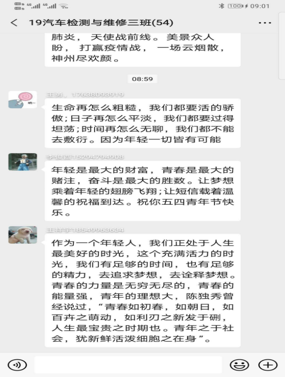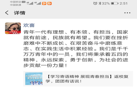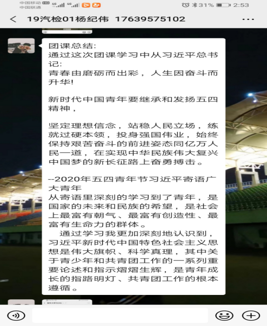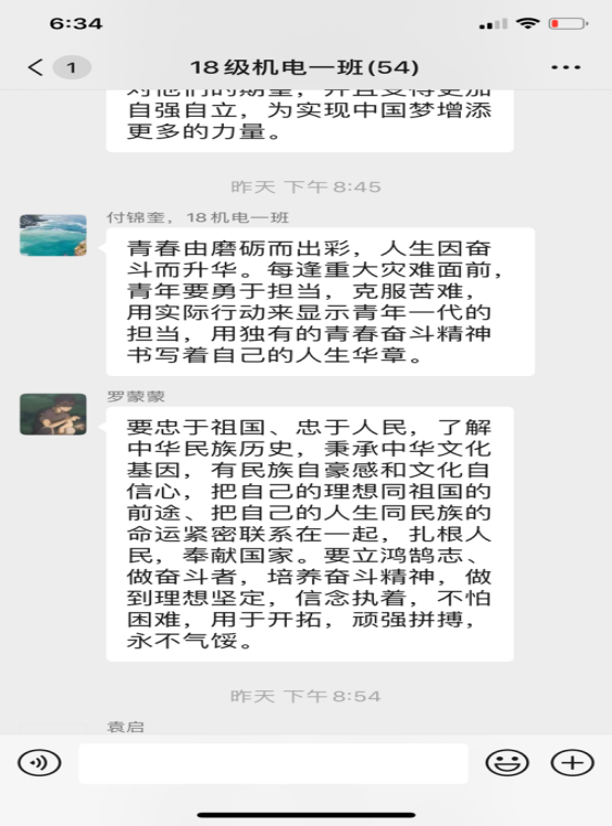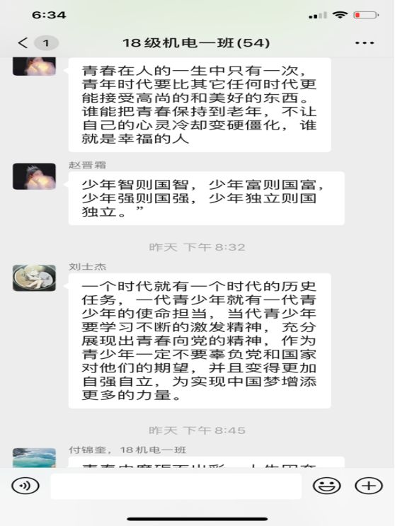本期团课围绕学习习近平总书记五四寄语精神,结合高校返校复学的时间节点,广大青年员工学习劲头热情高涨,纷纷以观看视频、微信群讨论、朋友圈分享等多种形式各班展开学习,下面为部分员工学习瞬间。